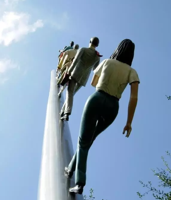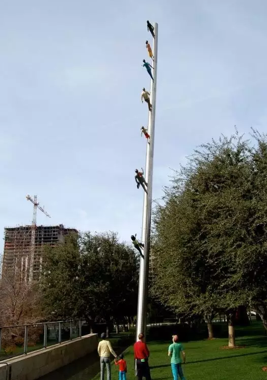 2004年秋天在洛克菲勒中心下沉廣場一側(cè),離《普羅米修斯》雕塑不遠(yuǎn)處,出現(xiàn)了一件大型公共藝術(shù)裝置作品,這是喬納森·博羅夫斯基創(chuàng)作的《走向天空》,是由洛克菲勒中心委托設(shè)計,并由公眾藝術(shù)基金贊助的。裝置重達(dá)7噸,描述了一行七人正秩序井然地在100英尺高的不銹鋼柱上向著天空行走的場景,其中有不同年齡、不同性別、不同種族、不同職業(yè)的人,他們正打破地心引力,走向人類不可企及的新空間。巨大的不銹鋼柱傾斜75度角插入洛克菲勒中心高樓環(huán)抱的廣場空地,向著東方,極為壯觀,形成一種與垂直城市空間相適應(yīng)的公共藝術(shù)空間形式。同時喬納森在地面上還安排了三個人在仰望這一行人,形成了一種場景式的公共藝術(shù)。廣場所有觀看者都不由自主地進(jìn)入情境之中,抬頭仰望,面向天空,陷入沉思,人們的視線停留在這行人行走的終點(diǎn),視乎看到了未來,明白了人類的潛力和極限。這件《走向天空》的公共藝術(shù)作品在2005年被轉(zhuǎn)移到德可薩斯達(dá)拉斯納希爾雕塑中心,今天在世界上還有兩件復(fù)制品,一件在賓夕法尼亞匹茲堡的卡內(nèi)基梅隆大學(xué)校園內(nèi),另一件在韓國漢城禾谷東的一個商業(yè)大樓前。