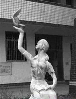 在禮堂旁邊建了一座少女讀書、手捧鴿子的雕塑
